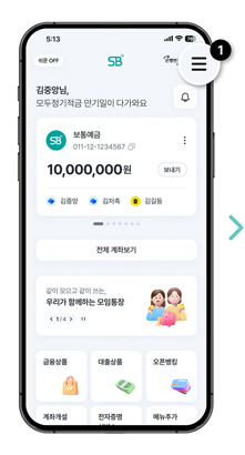 SB톡톡플러스 로그인 후 우측 상단 메뉴 버튼을 클릭하여 이동합니다.